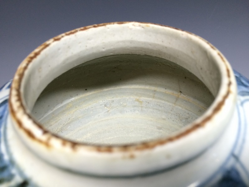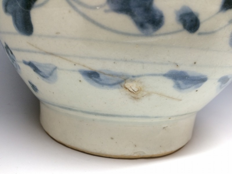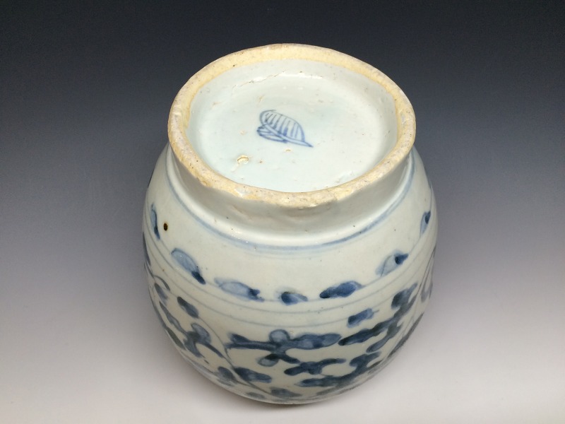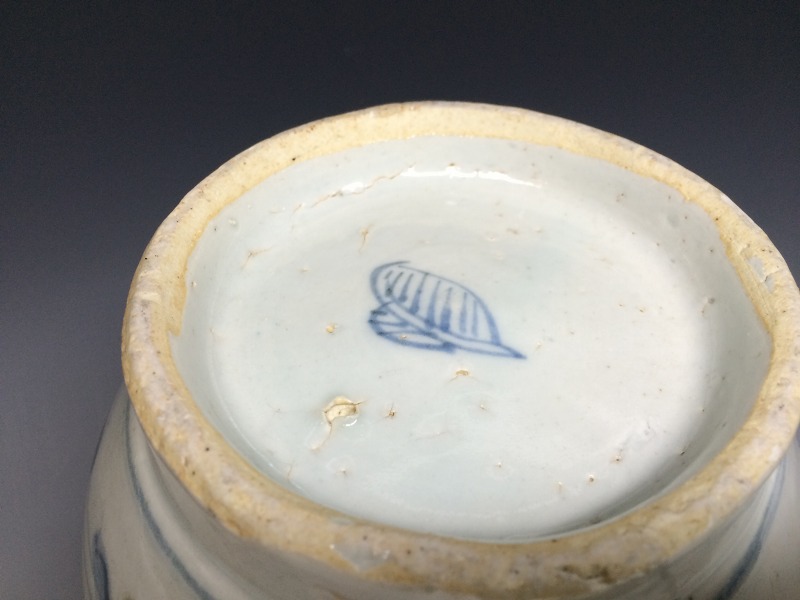 中国明代末期頃の青花作品でおおらかな筆捌きで胴部は唐花唐草文、高台には木の葉が描かれております。画像の通り、胴部に一部釉流れ、当り疵による表面剥離がございますが鑑賞上の支障はさほどありません。(中国 16世紀)