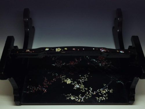 江戸後期~明治初頭頃、いわゆる長崎青貝細工とよばれるもので、紅梅白梅をあしらった軸掛け(掛け軸を置く台)作品です。 時代のものですので経年の傷みや青貝の剥離等は画像の通りございますが時代を考慮すると保存状態は良好と言えます。