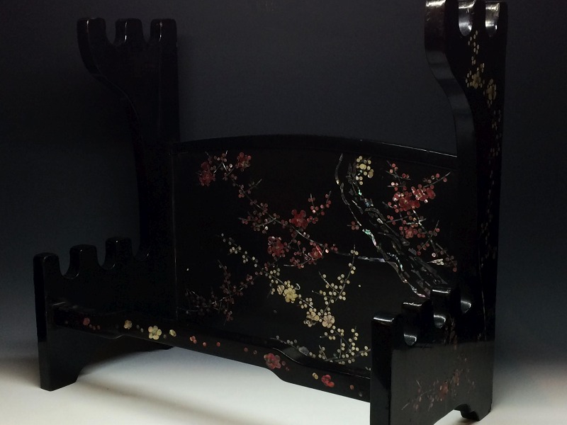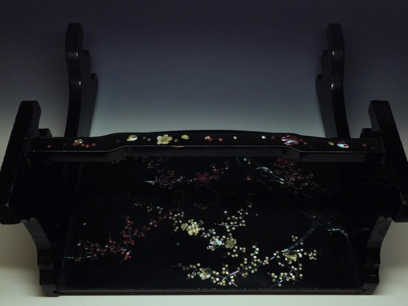 江戸後期~明治初頭頃、いわゆる長崎青貝細工とよばれるもので、紅梅白梅をあしらった軸掛け(掛け軸を置く台)作品です。 時代のものですので経年の傷みや青貝の剥離等は画像の通りございますが時代を考慮すると保存状態は良好と言えます。