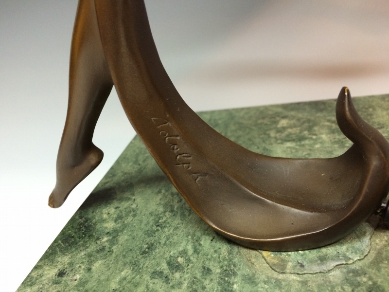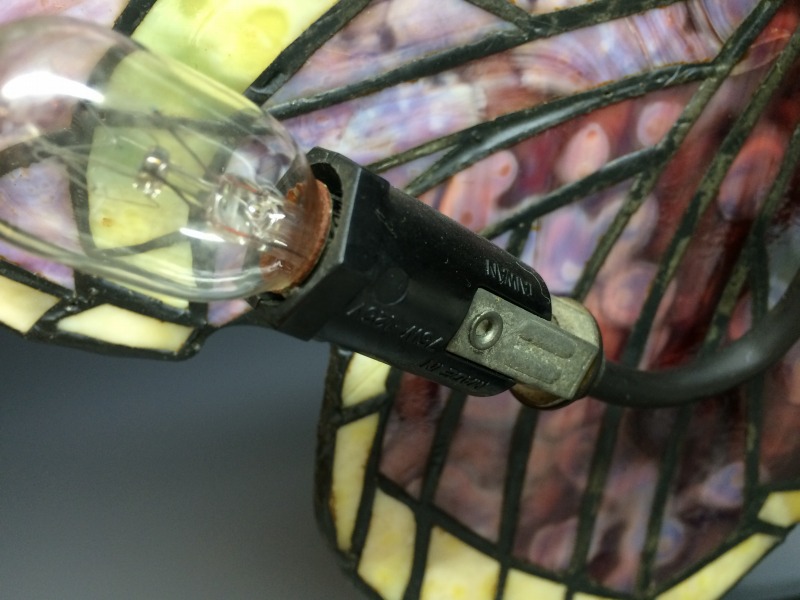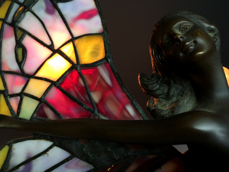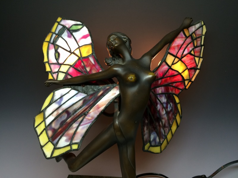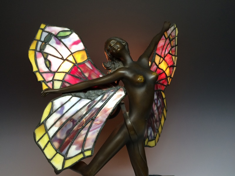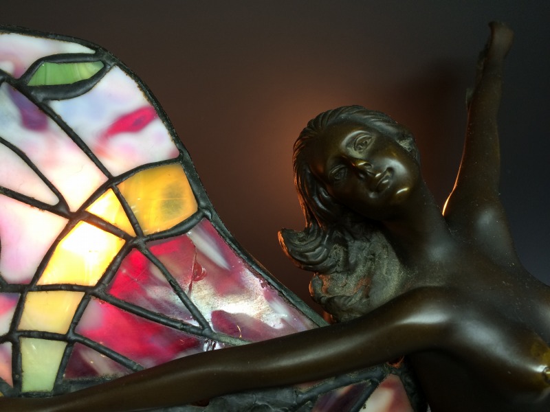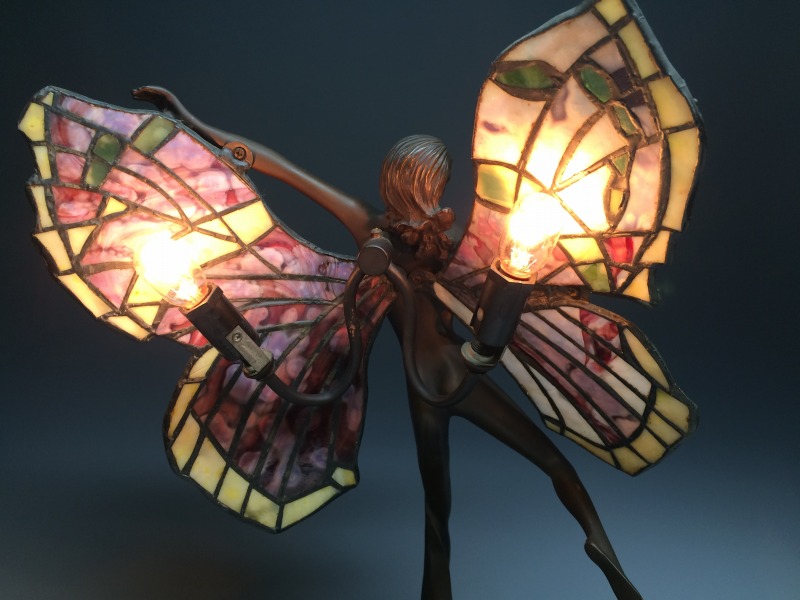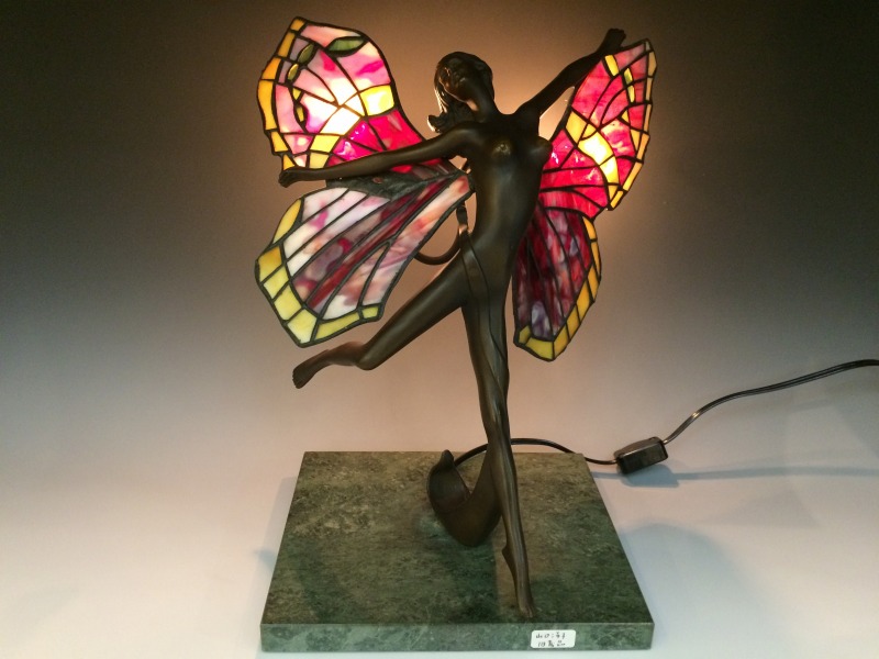 アールヌーボー様式の意匠を色濃く残した作品で1940年代頃の製作です。作家名がアドルフと有ります。 羽根の部分はティファニースタイルのステンドグラスで女性はブロンズ製、台座は大理石です。 作家、作詞家として活躍された山口洋子さんの銀座のクラブ「姫」にて長年愛用されていた作品のようです。古いものなので台座の部分に画像の通りの罅割れがございますが使用上の支障はありません。調光は二段階、今でも十分に妖艶な光を放ってくれます。