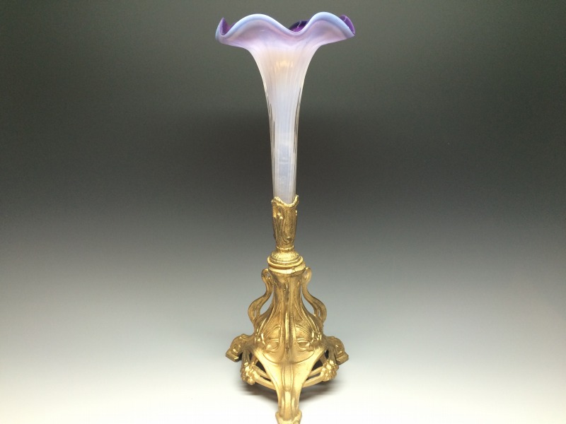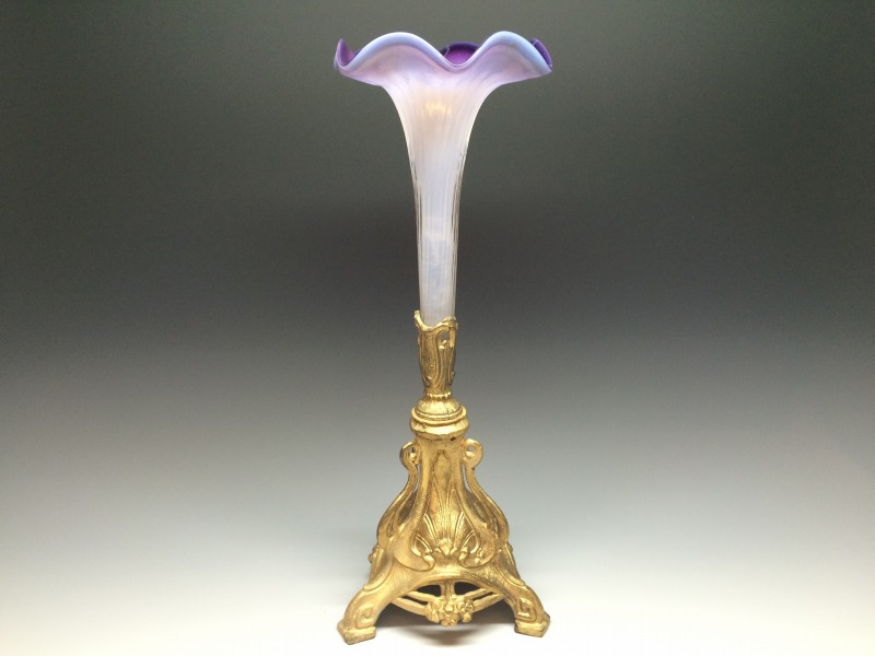 19世紀末~20世紀初頭ぐらいの英国製、とても美しい朝顔形のガラスの一輪挿しにアールヌーボー様式の金属製塗金台座が誂えられています。 画像の通り口縁の部分の小さなチッピングを認めますがそれ以外は大丈夫です。 日々使ってお楽しみいただけるアンティークです。