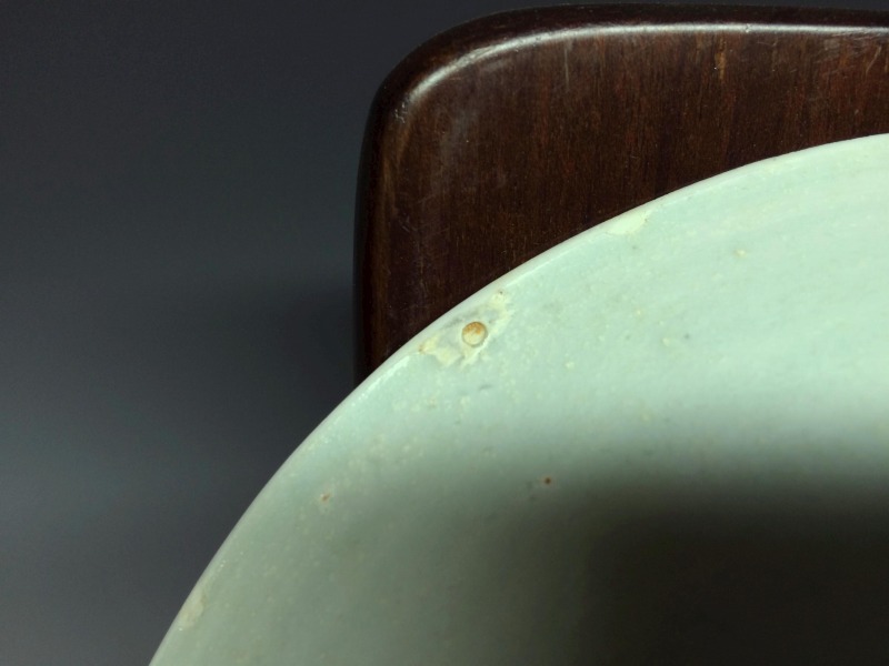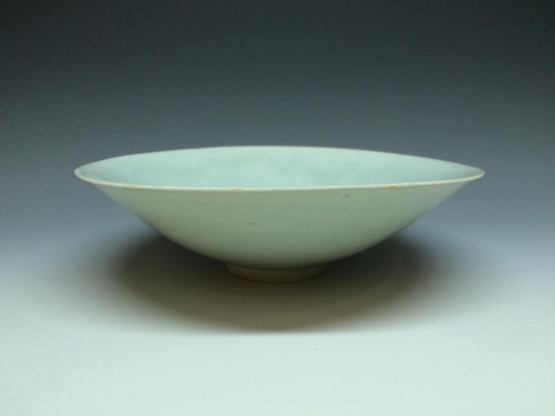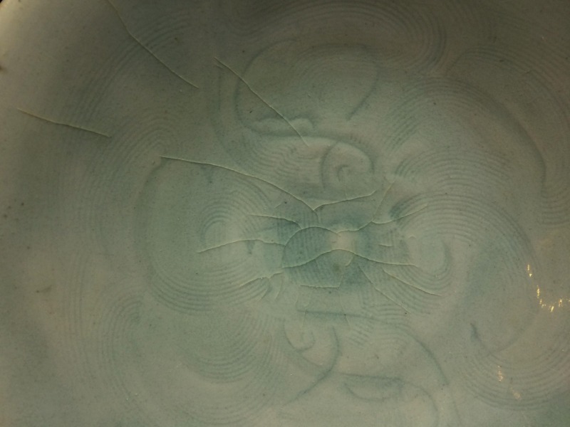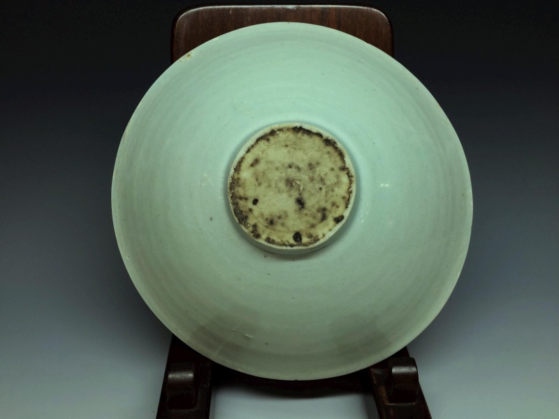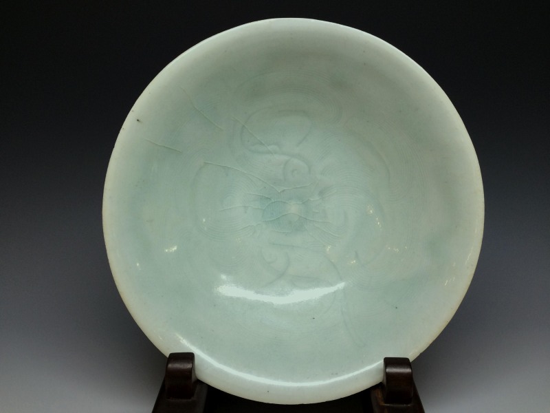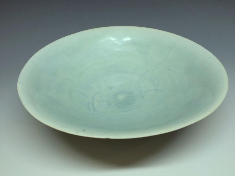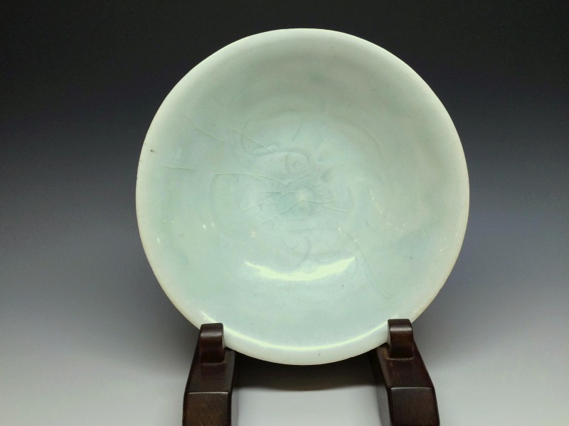 いわゆる影青(いんちん)と総称される中国宋時代の青白磁作品で見込みに繊細な劃花技法で双魚文がございます。 画像の通り海揚がりもののようで口縁部に付着カルシュウム除去のための研磨擦れを認めます。見込み部分の磁貫は表面ガラス層のみで磁胎には達しておらず指で弾くと磁器特有の心地よい音がします。高台には泥銀様の付着を認めます。その他画像の通り大変美しい作品ですのでお楽しみください。