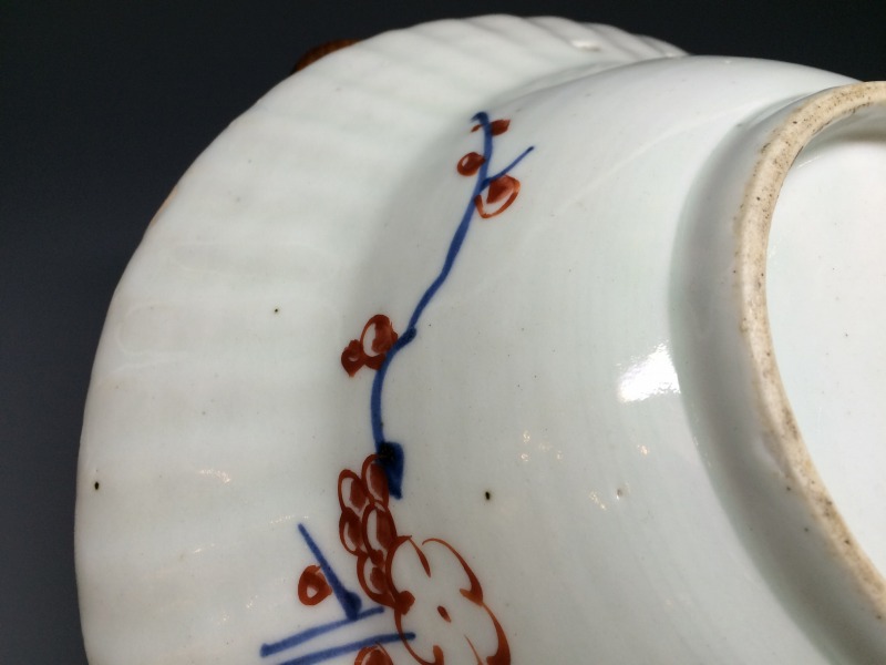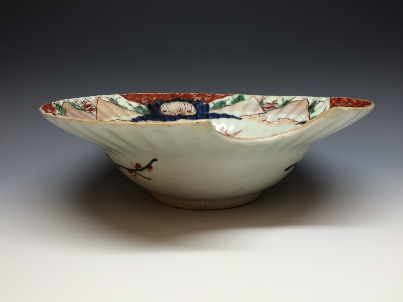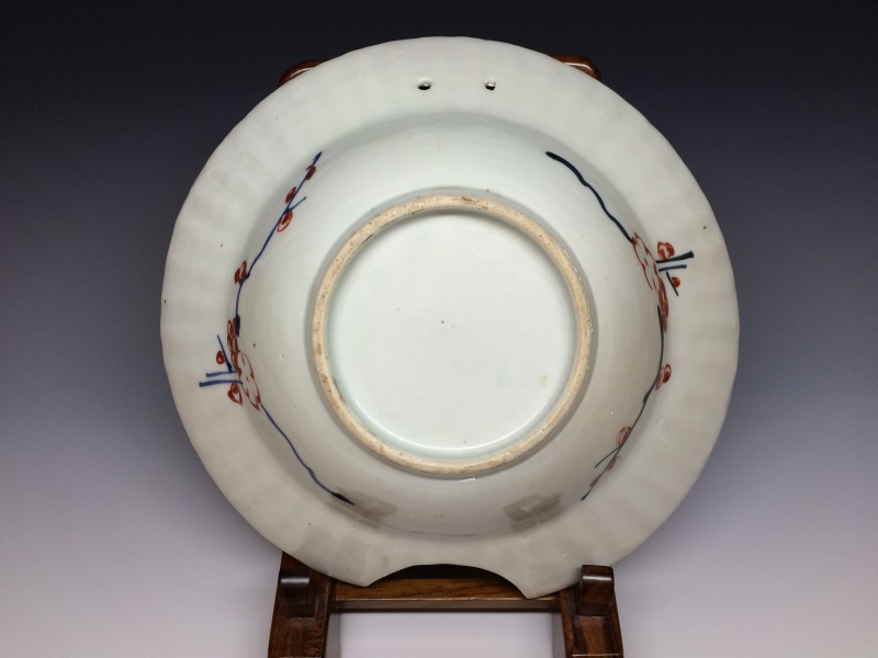 江戸時代、元禄~享保期にかけてオランダ東インド会社からの注文に基づき有田で焼かれたいわゆる髭皿(ひげざら)と呼ばれる口縁部分を半月状に切り取った兜鉢状の変形皿です。 上部には紐通しのためのニ穴あります。 本作品は縁部分が鎬型になっており深兜形に人物文でちょっと珍しい作品ですね。画像の通り口縁に気付かない程度の僅かなソゲ充填を認めますが表からの鑑賞上の支障は皆無です。