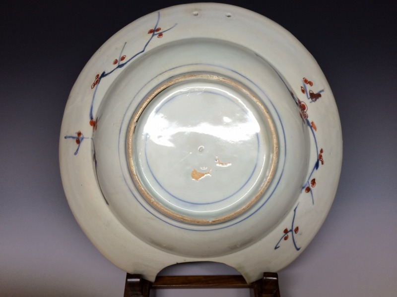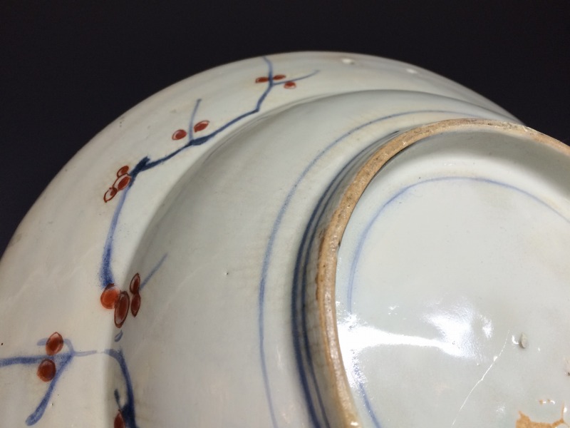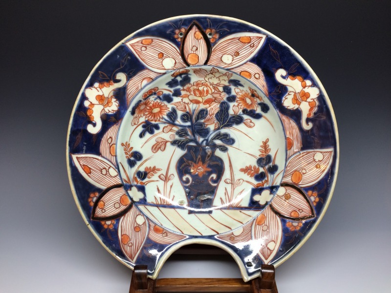 江戸時代、元禄~享保期にかけてオランダ東インド会社からの注文に基づき有田で焼かれた「髭皿(ひげざら)」と呼ばれる口縁部分を半月状に切り取った兜鉢状の変形皿で本作品も元禄時代の希少な髭皿です。