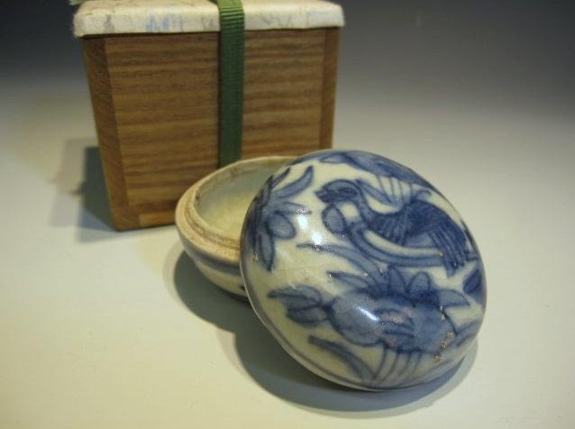 安南(現在のベトナム)あるいは中国明代南部諸窯の作品で、愛らしい香合一点です。 茶道を嗜まれる方のご愛用品だったらしく保管用の箱等も画像の通り揃っております。 身側の内側立ち上がり部分に一見ホツらしき凹みがあるのですが、よく観ると焼成時のクッツキを外した痕のようです。 いづれにしても蓋が被ると見えなくなる部分です。