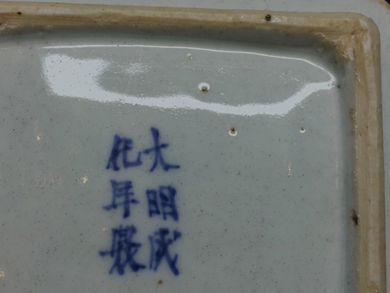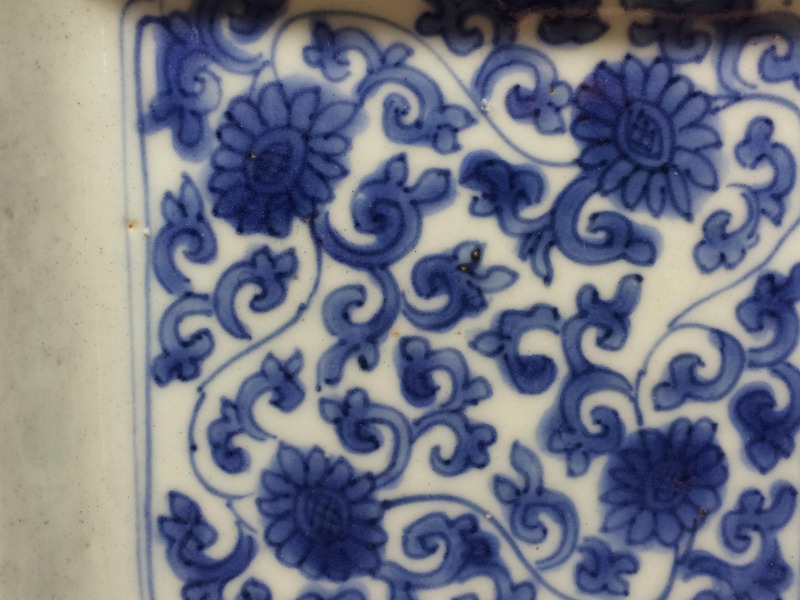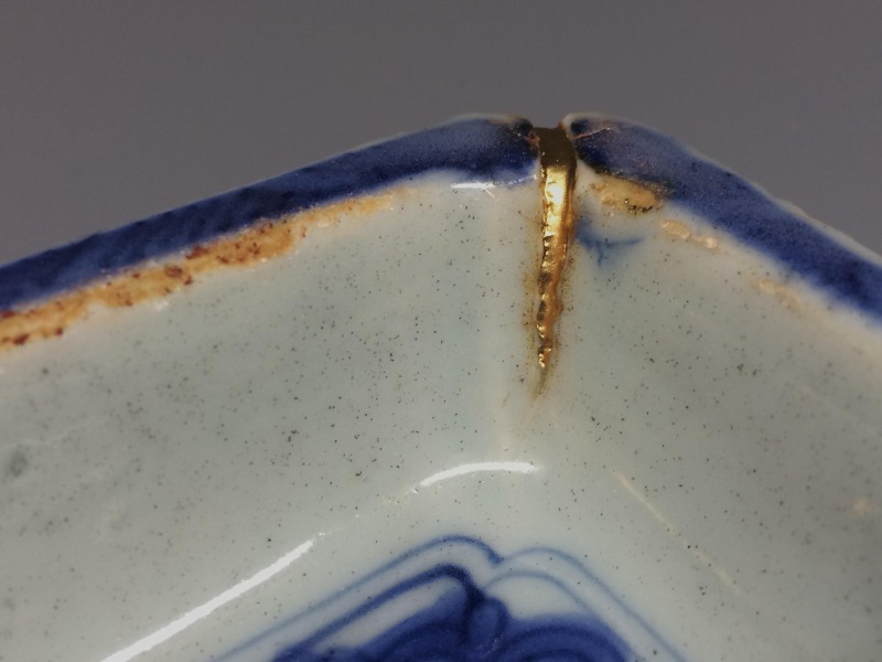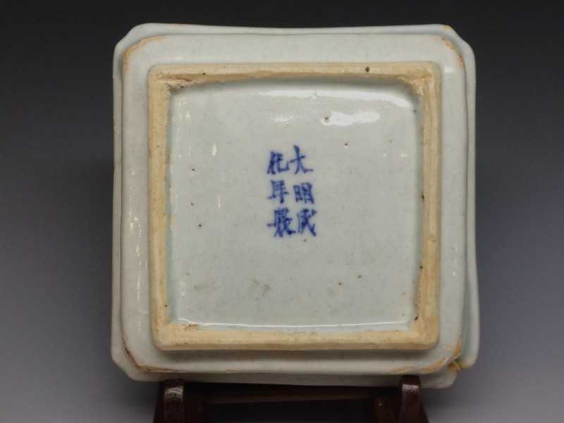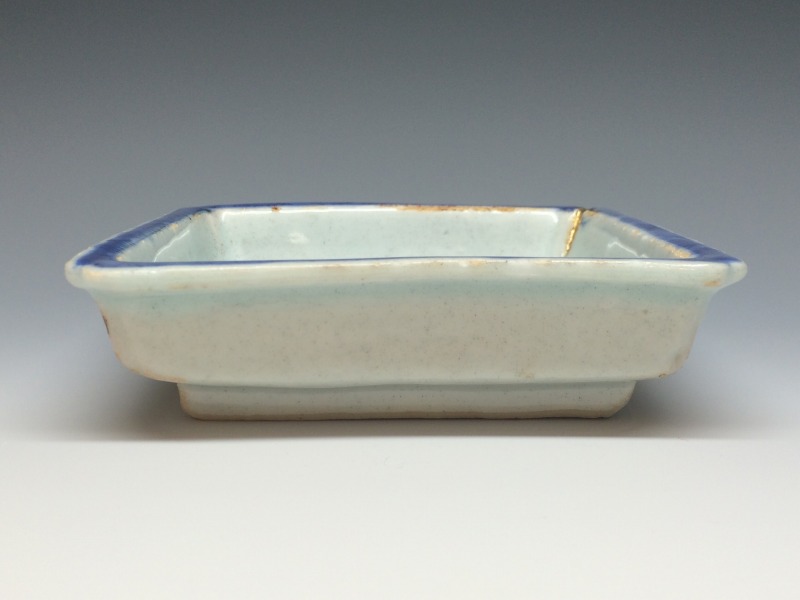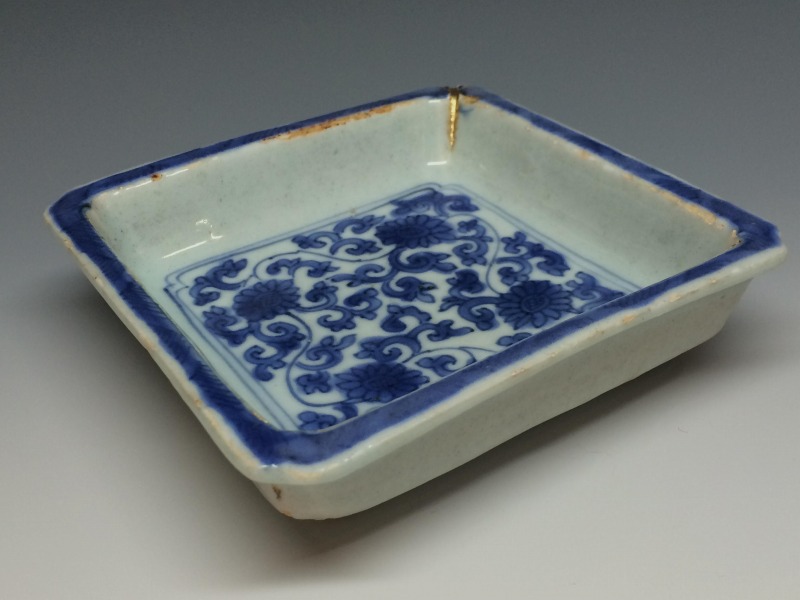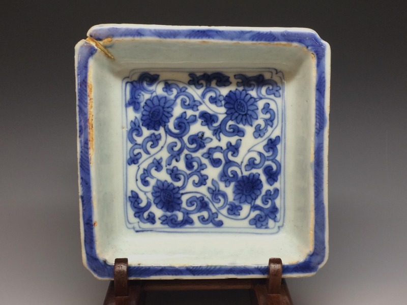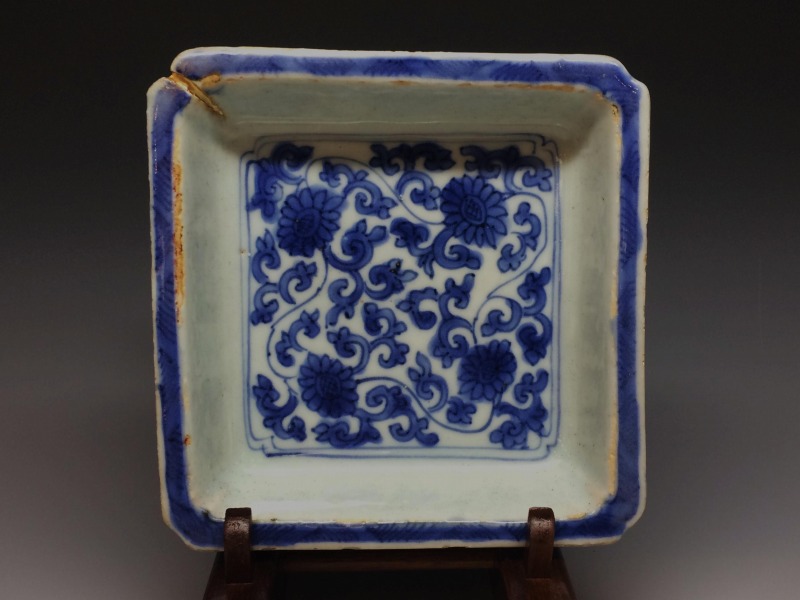 中国明代末期のいわゆる古染付と呼ばれる作品群の一手です。画像の通り角に一箇所窯疵の金繕いを認めますが後傷ではございません。 その他、古染独特の虫喰い等は約束通りです。お楽しみ頂ければ幸いです。