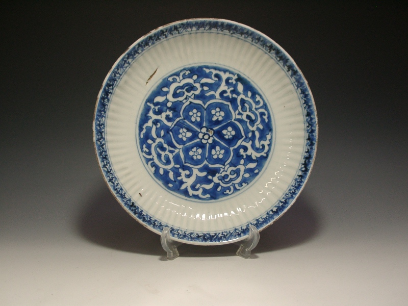 中国明代末期~清朝初期にかけての、いわゆる古染付と呼ばれる作品で、本作の特徴は鎬文の器形。口縁の虫喰い、砂付き高台、高台内の唐傘文(飛び鉋)はお約束通りです。 画像の窯疵はございますが、ニュウやホツレなどの後傷はなく完好品。 焼き上がりも堅く、指で弾くと心地良く響きます。