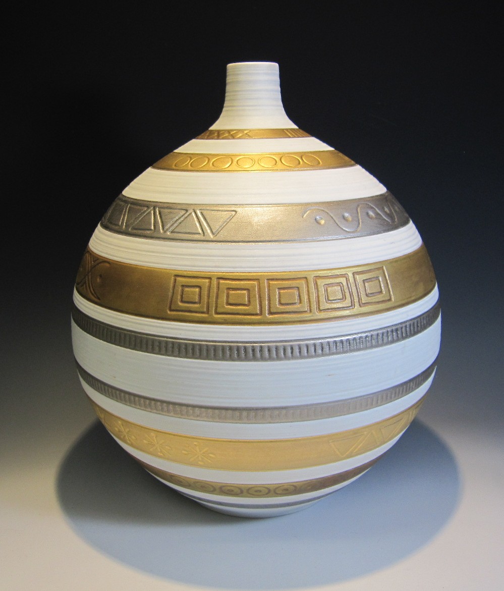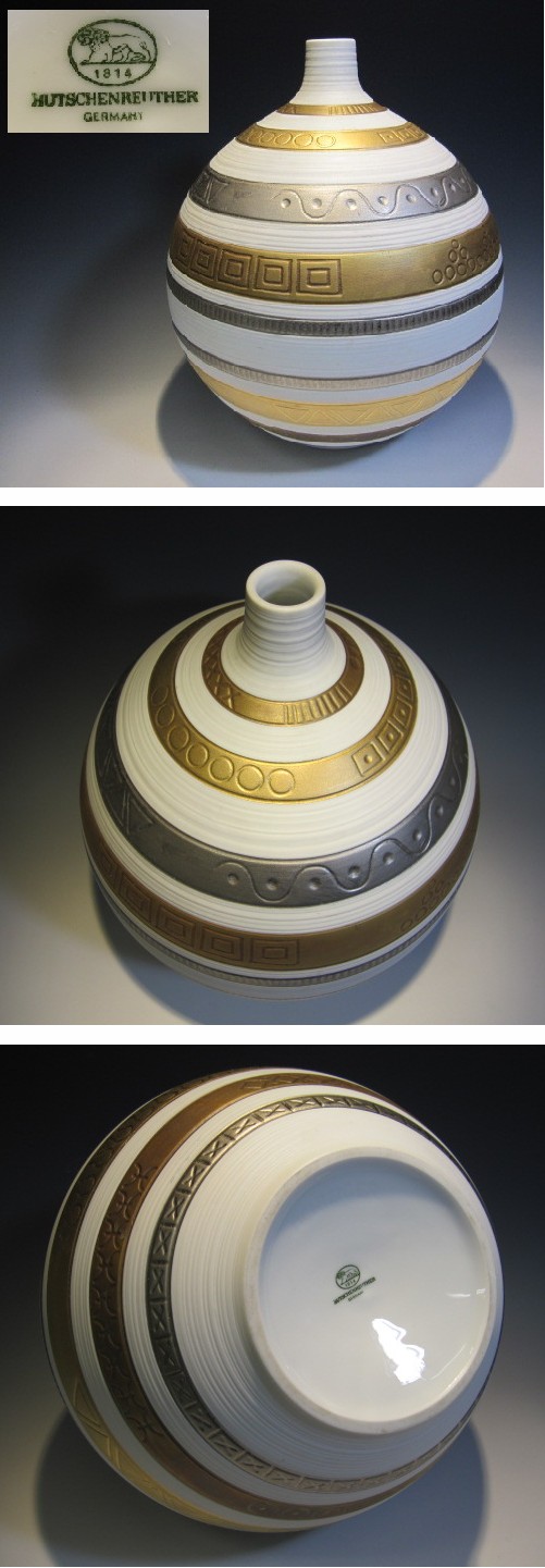 ドイツの名窯、フッチェンロイター、創業以来、伝統を重んじ「人間の手に勝る技術・機械は存在しない」という信念を貫き、数百人の手を経て白磁が完成され、絵付け作業は手作業にこだわっている窯です。 本作は限定品だったようで通常店頭では見かけない珍しい作風の一点です。 艶消しの白磁胎にイスラミックな幾何学文様が陰刻され、その上から金銀銅釉が施釉されています。 飾り染み・汚れは多少ございますが磁胎には傷はありません。 20世紀、ドイツ製。