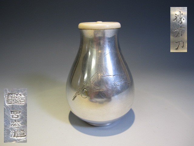 純銀製、宮本造の茶器です。 加賀あたりの金工師の彫刻でしょうか、雲間から朝日が昇り燕?が三羽舞っております。 嘴部分は金象嵌されています。 画像の通り、作家銘が入っておりますが作家詳細については分かりません。 高台縁に小さな線状の凹み(8mm程度:画像参照)がございますが気にならない程度です。 象牙蓋と御仕覆が付属しますが、仕覆の生地には経年劣化(傷み)がございます。 大正~昭和初期