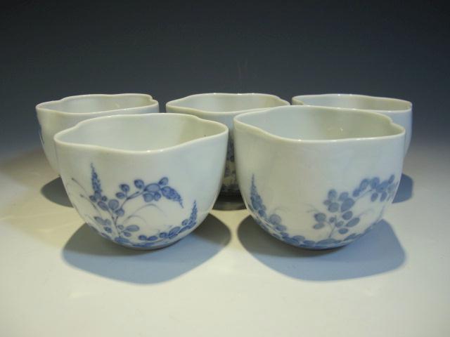 ■作品概要■ 商品番号11923GK27 大変上品な平戸、三川内焼の作品で絵柄は萩でしょうか。 器形も指押さえで花形に仕上られた珍しいものです。 五客揃っており、窯疵(黒点など)以外は傷無く完好品です。 江戸後期(文化~文政)